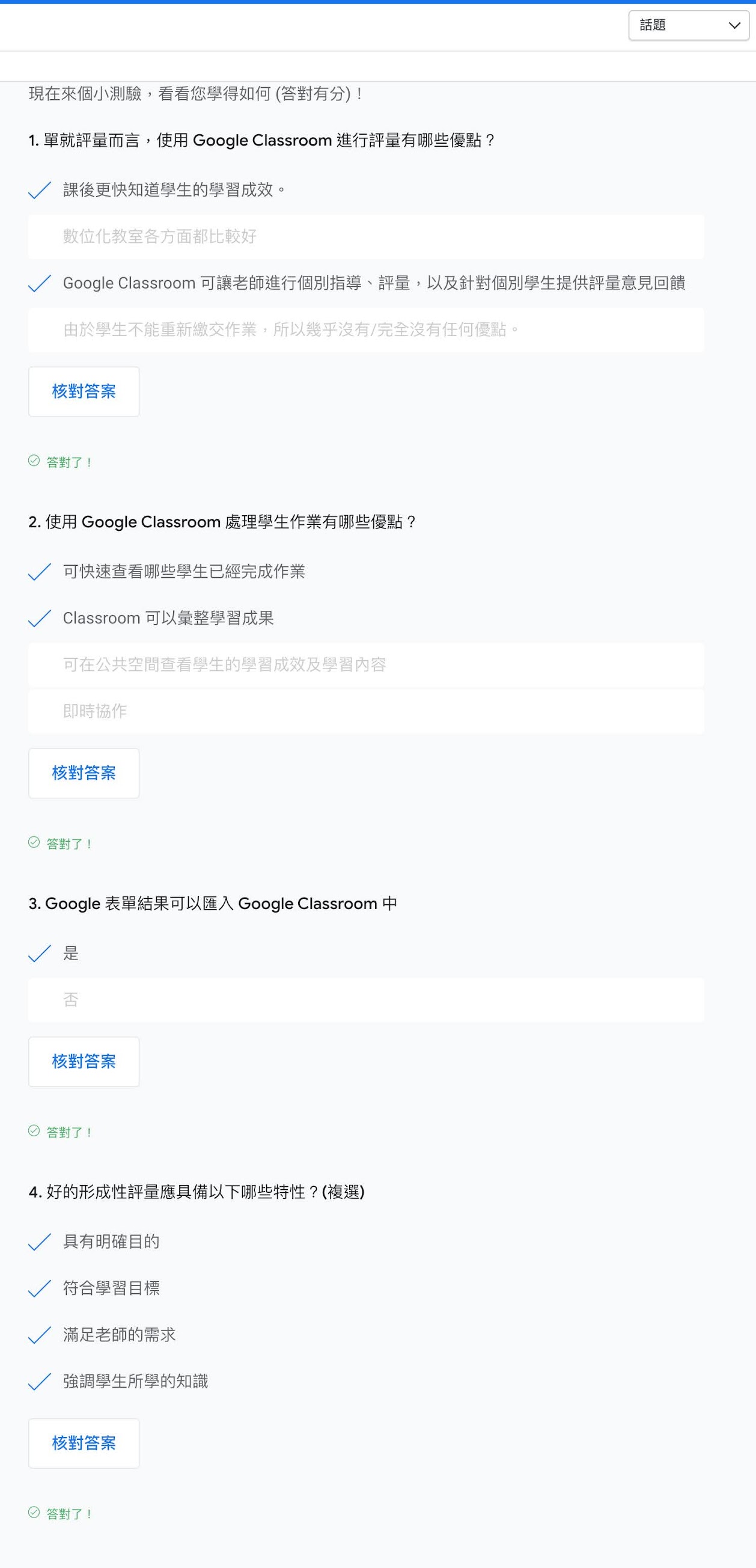 • 使用 Google 表單進行測驗:老師可指定正確/錯誤的答案 (以及對答案的評論說明),讓學生在提交答案後就能看到成績。